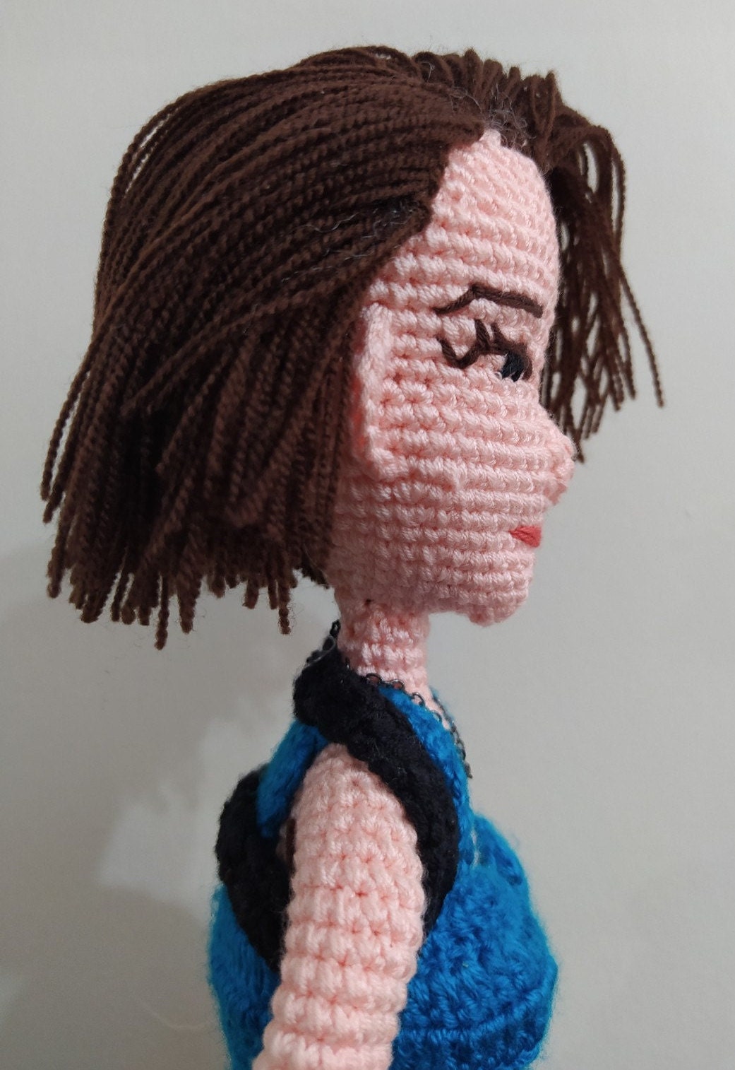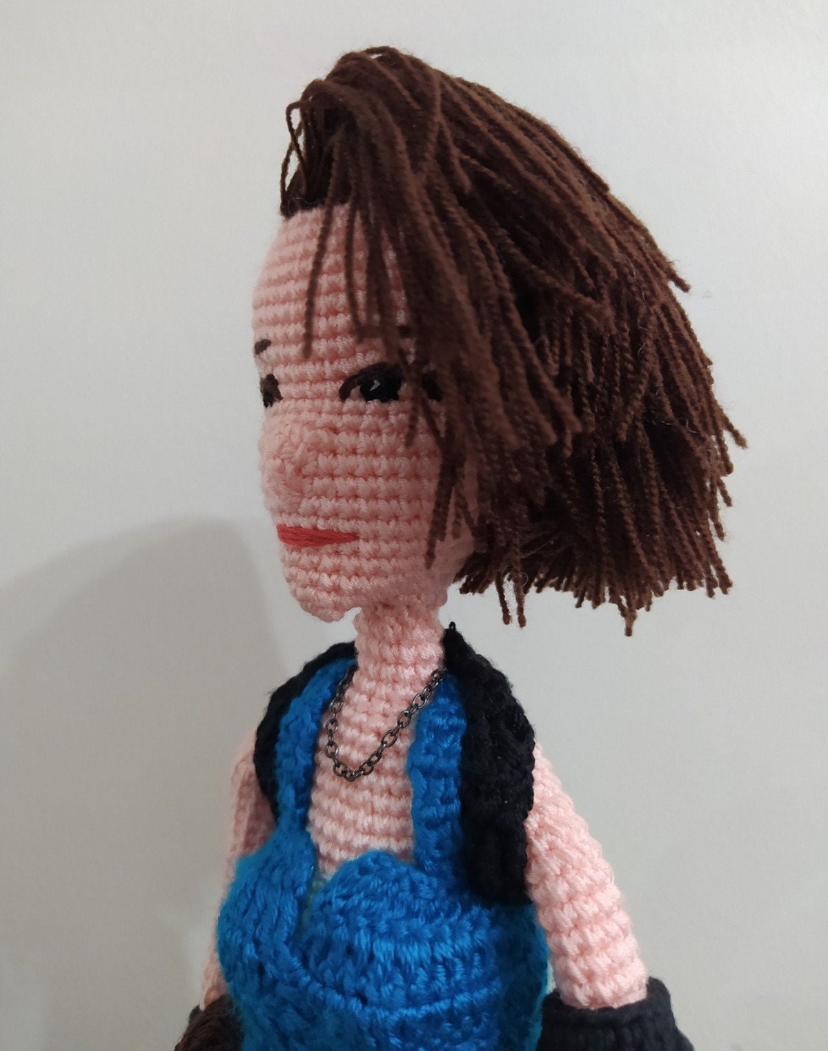 S.T.A.R.S. Uniform: We meticulously recreated her iconic outfit, including the signature blue beret and tactical shoulder pads. The yarn textures distinguish the heavy gear from the uniform fabric.